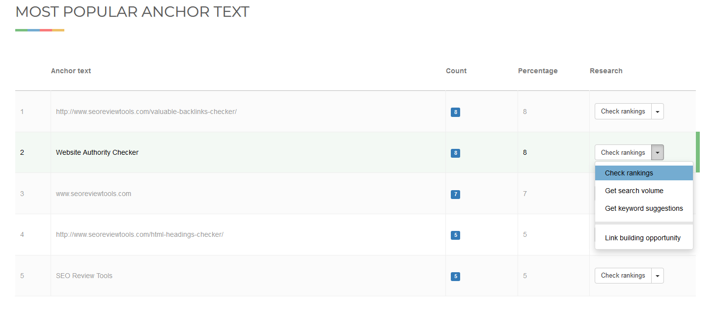 - Most popular anchor text (the most used link text).