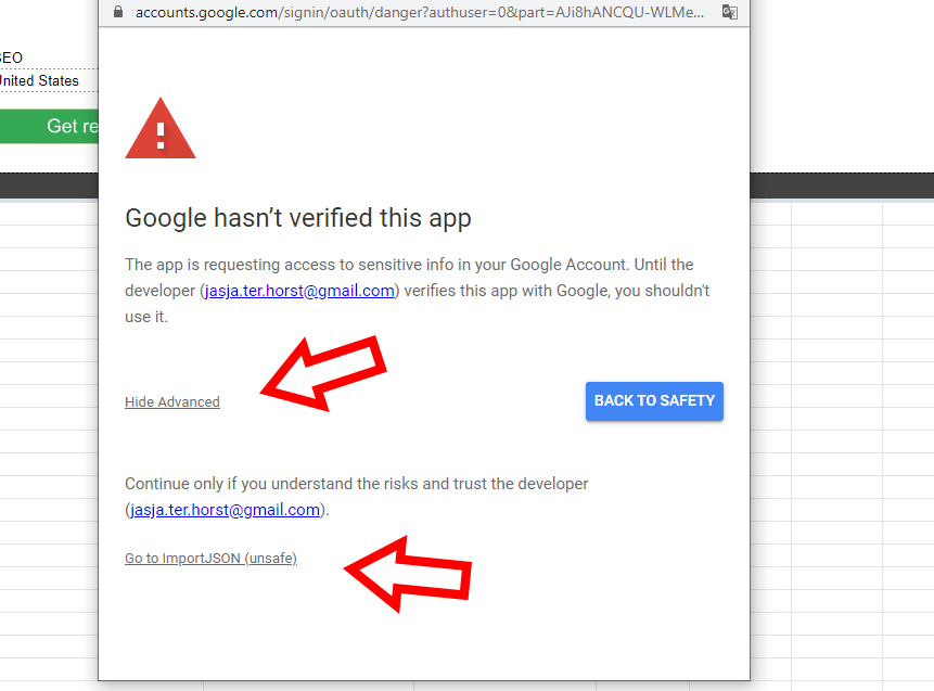 - Google will show the “Google hasn’t verified this app” message, click “advanced”